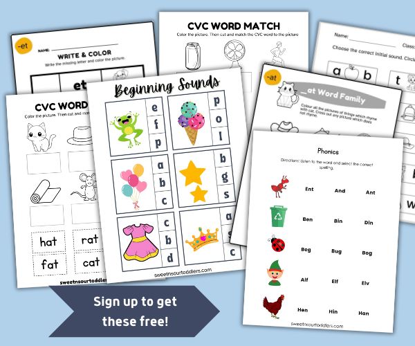 PPS: I have some amazing CVC words activity sheets that you can download, print and start using. Use the sign up box at the end of this post to get access to them!